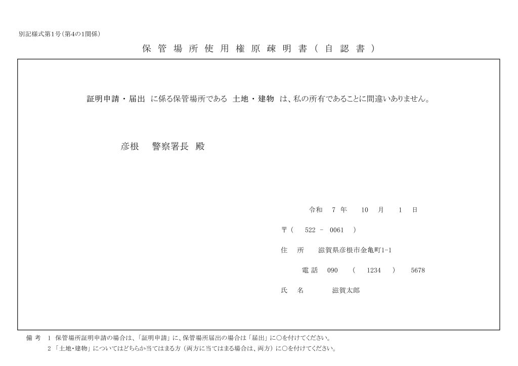 保管場所が申請者が保有する土地の場合は、この「自認書」が必要です。保管場所の住所を記載する必要はなく、記入した日付と、申請者と同じ住所、氏名、連絡先を記載しましょう。
