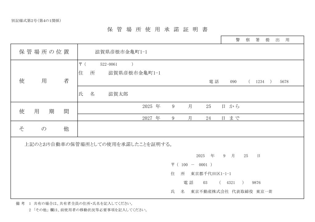 保管場所が申請者と違う人、会社等が保有する土地の場合は、この「保管場所使用承諾証明書」が必要です。