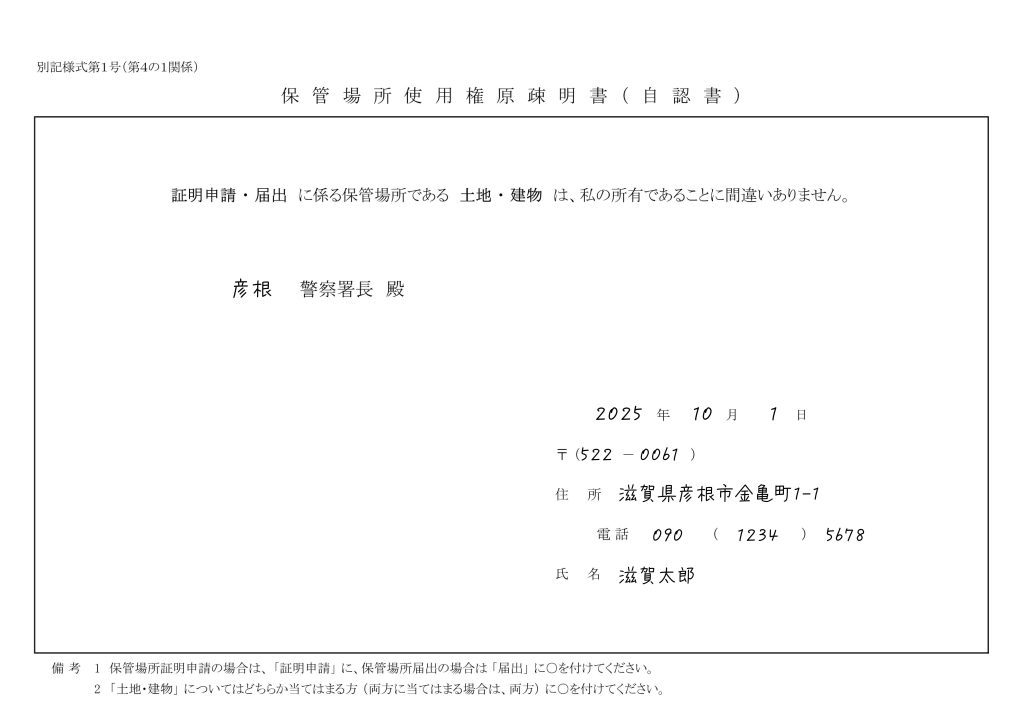 保管場所が申請者が保有する土地の場合は、この「自認書」が必要です。保管場所の住所を記載する必要はなく、記入した日付と、申請者と同じ住所、氏名、連絡先を記載しましょう。