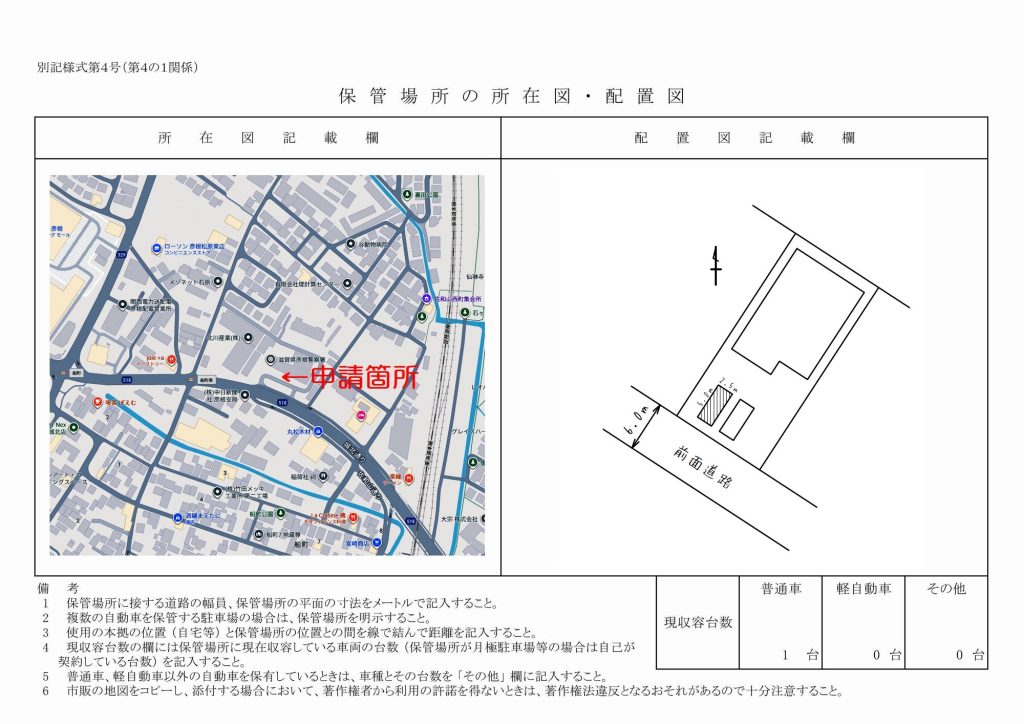 縮尺は特に決まってはいませんが、目印となるおおきな施設、建物等があれば、申請する保管場所の位置もわかりやすいですね。あまり広い区域だと、具体的にどこかわかりにくいし、逆に、狭すぎても、いったいどこなのかわからない、ということがありますので、わかりやすい地図にしましょう。