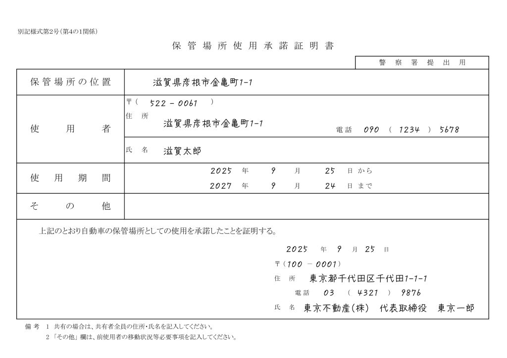 保管場所が申請者と違う人、会社等が保有する土地の場合は、この「保管場所使用承諾証明書」が必要です。